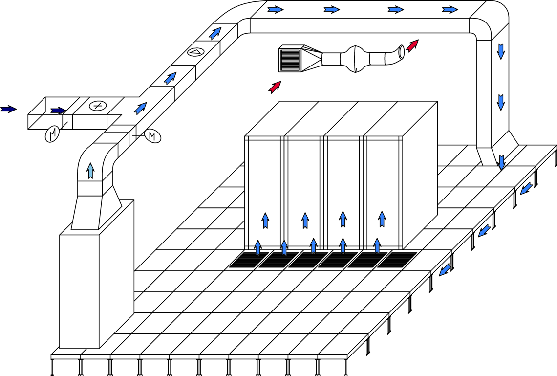 С помощью системы воздуховодов и вентиляционных решёток мы можем распределить поток воздуха непосредственно к каждой стойке и изменить расход воздуха в зависимости от тепловой загруженности каждой из стоек. Расход воздуха регулируется таким образом, чтобы настилающаяся воздушная струя доходила до самого дальнего юнита относительно воздухораспределительной решётки.